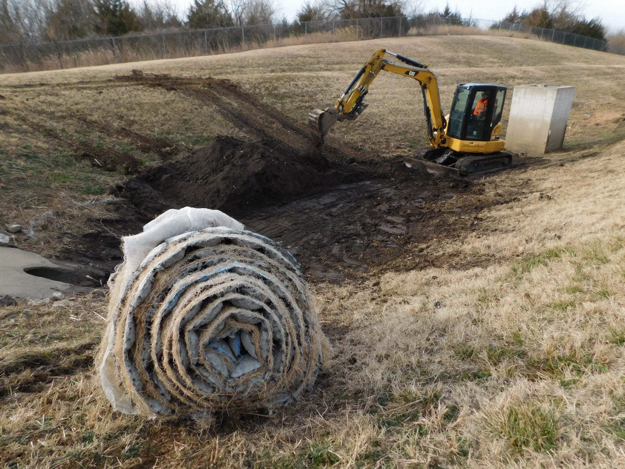 EWI identified this particular trench site at a department store in south central Kansas as a candidate for Flexamat® installation after dealing with habitual erosion and stormwater issues in the expansive 300,000 square foot basin.