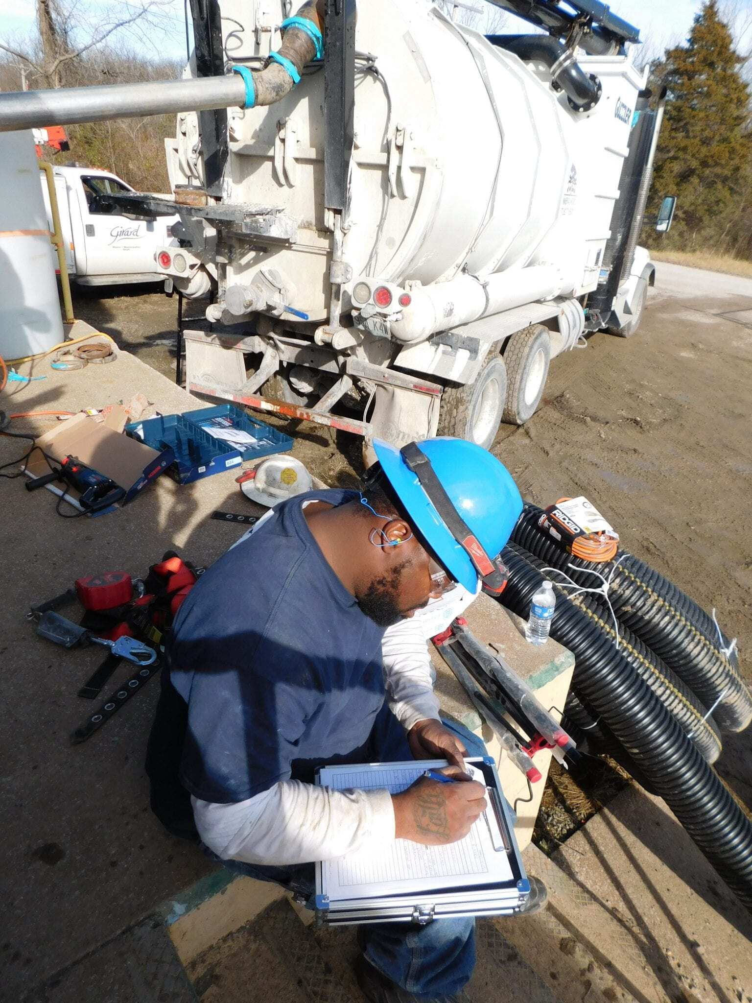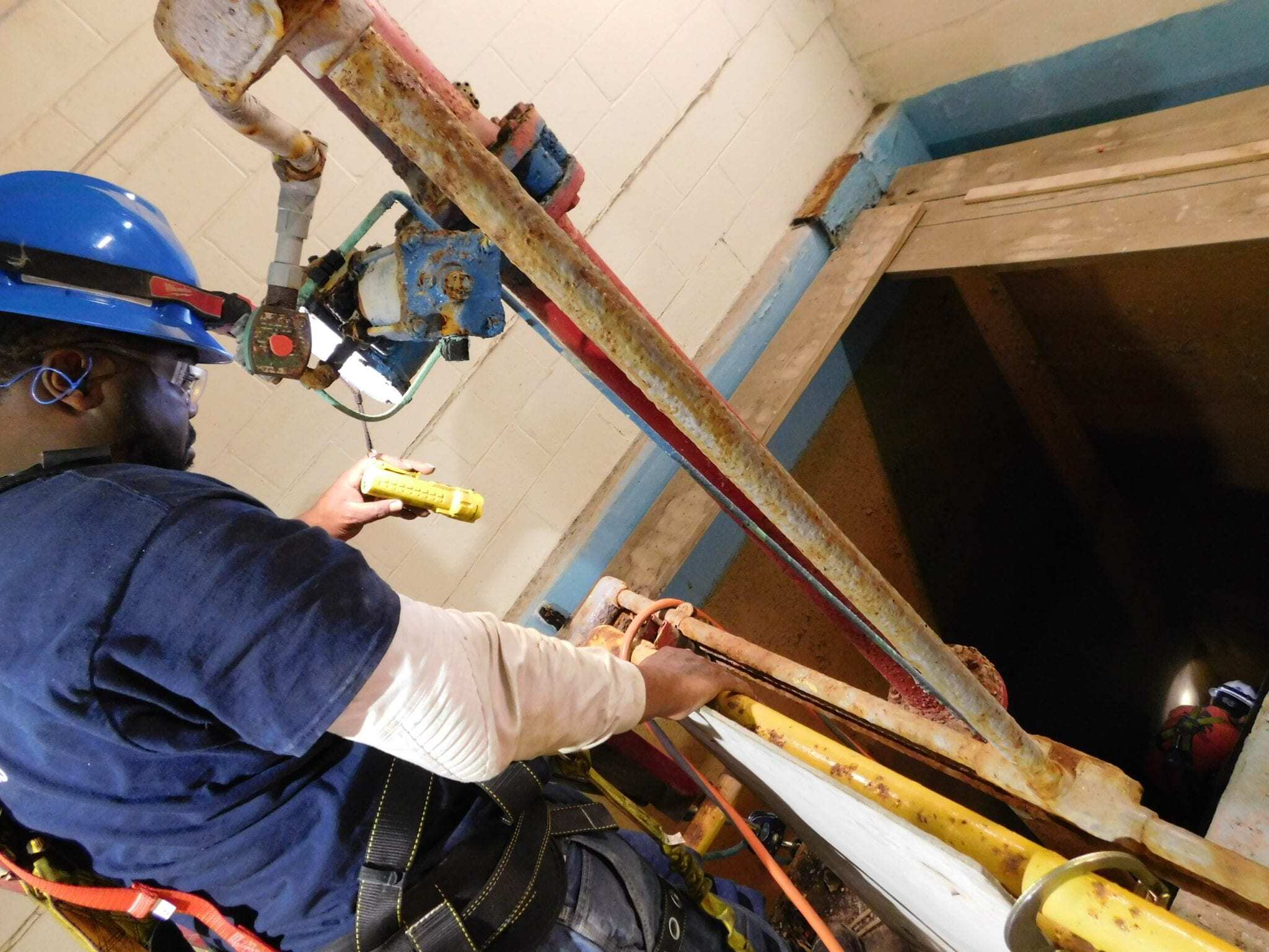 The job began in early 2020 with the removal of media from the plant’s four cell concrete gravity filter. The media was removed by EWI field technicians using a pair of jackhammers and an ADS hose running to an EWI-owned vac truck. Technicians would don fall protection harnesses, descend a step ladder into one of the four cramped cells and begin the laborious process of removing the filter media that had solidified to the bottom of the cell. The work was backbreaking and tedious, complicated by the fact that much of the media was as solid as sandstone, but the technicians preserved.