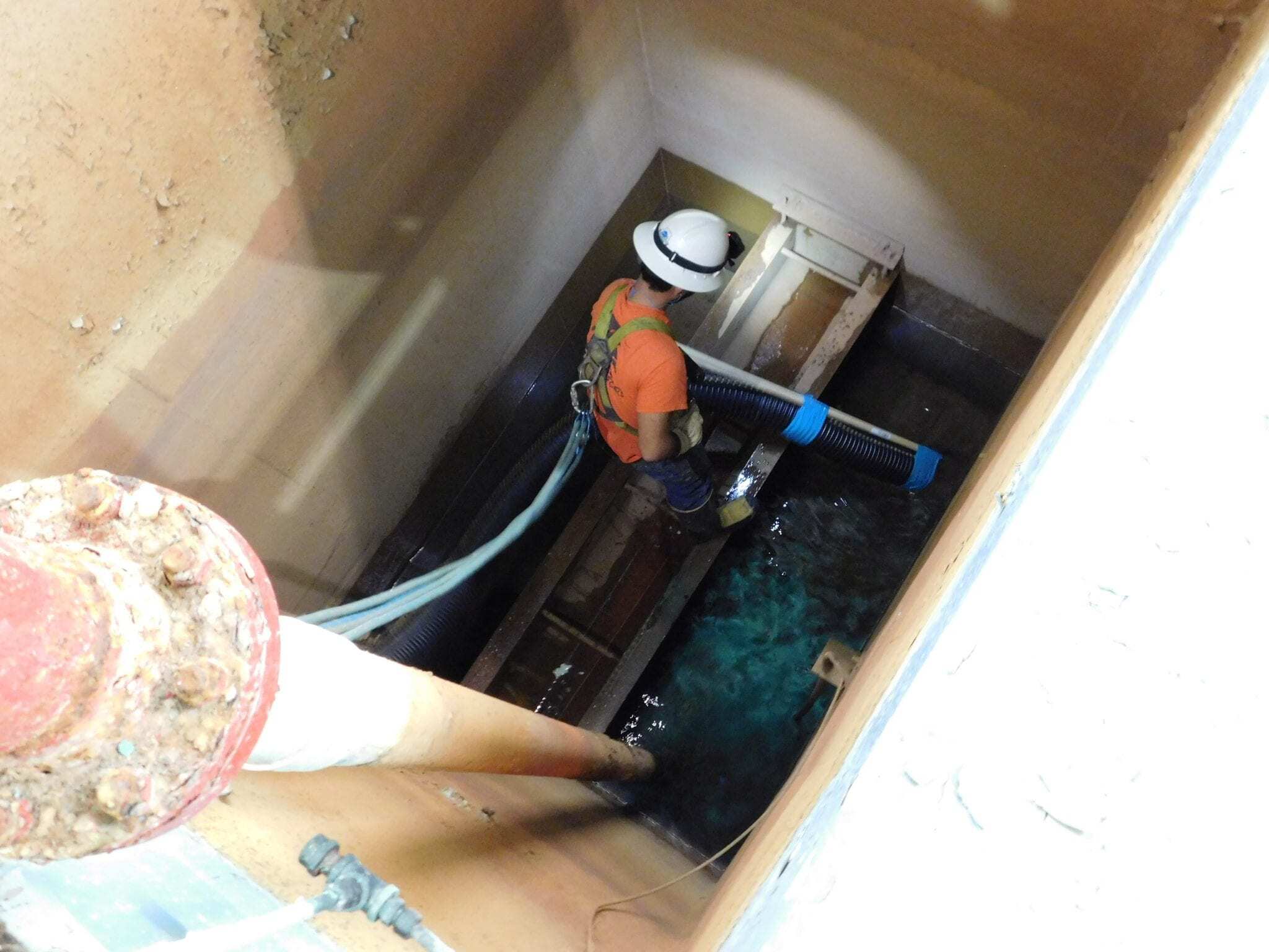 After every layer installed, EWI backwashed the sand to clean and settle the filter. As the backwash drained, a field technician would put on a respirator and harness, descend a step ladder and use a squeegee to sift off the top layer of media foam from the backwash.